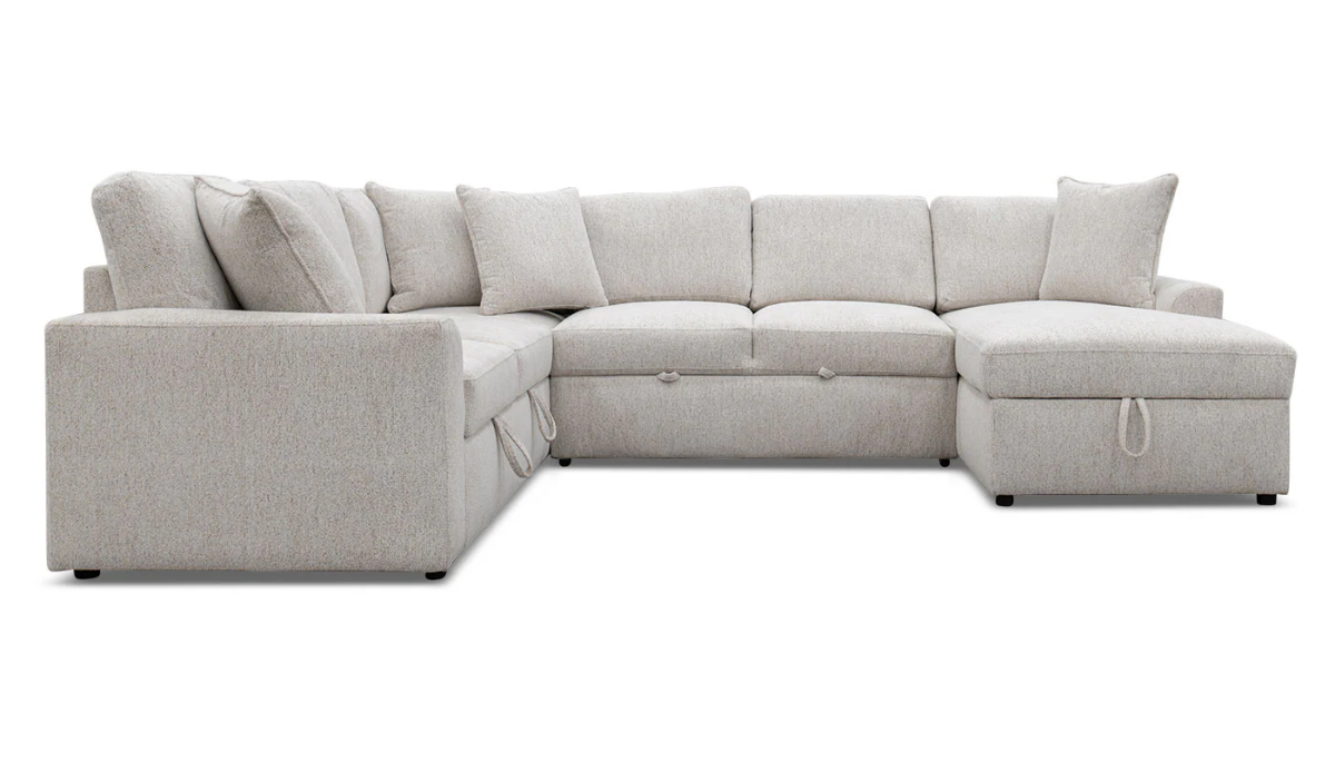 Our Isaac sectional is a testament to our commitment to excellence. Built with a sturdy frame, this sectional is upholstered in durable 100% polyester fabric that is both family and pet-friendly. Designed for maximum comfort, the cushions are filled with 1.8 lb high-density foam, providing excellent support, while the pocketed coil core seating ensures long-lasting durability and a plush seating experience. The sectional comes with the option of a chaise on either the left or right side, adapting to your room layout with ease. It also features a convenient pull-out trundle that transforms the sectional into a comfortable built-in sofa bed, perfect for overnight guests. Hidden storage under the chaise provides extra space for stashing blankets, pillows, or other essentials, keeping your living area tidy and organized. Complete with stylish throw pillows, our Isaac sectional is a practical and stylish addition to any home. Available in cream or green.Read More